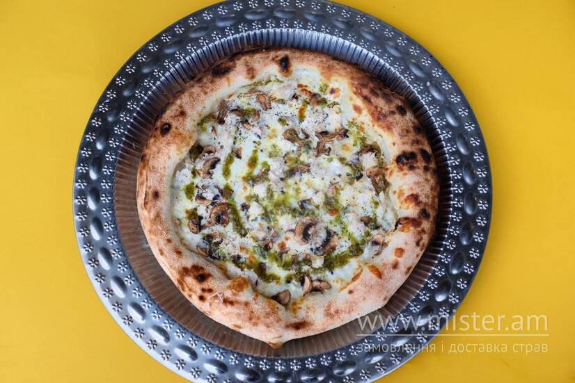 Вершкова основа, моцарелла, соковите куряче філе, пікантний дор блю і печериці — створюють глибокий, насичений смак. Доповнюємо пекоріно, ароматний соус песто та щіпку сушеного базиліку — справжня італійська насолода в кожному шматочку!