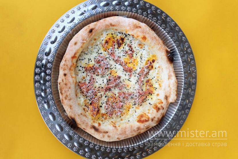 Вершкова основа, тягуча моцарелла та чеддер, рвана телятина з димком — це любов із першого укусу. Додаємо кунжут, сушений базилік і орегано для ідеального балансу аромату та текстури.