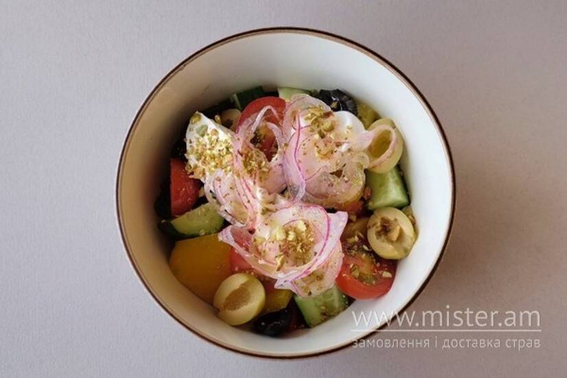 Черрі, томати рожеві, огірок, болг перець, синя цибуля, оливки каламата, крем фета з оливками кнелі.