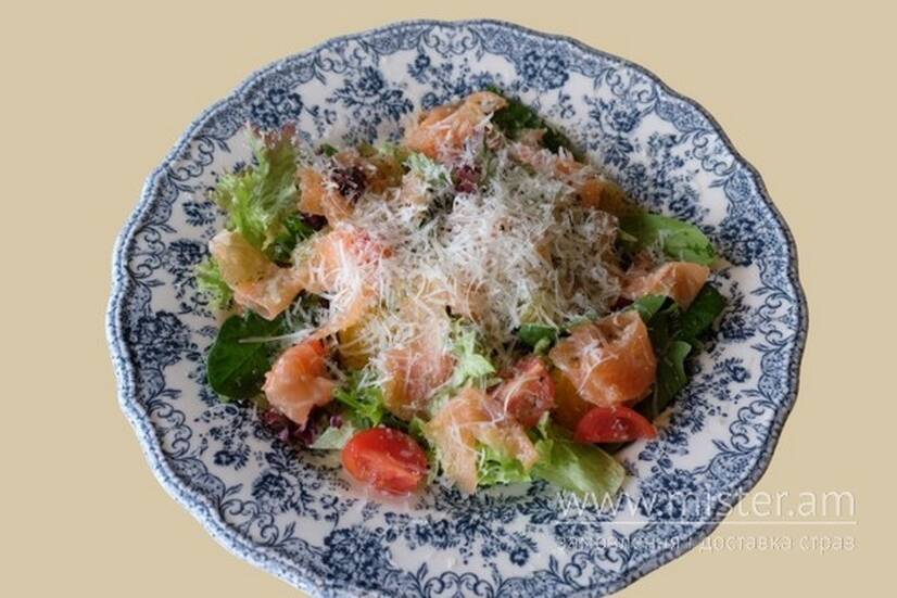 Ніжний слабосолений лосось, свіжий мікс салатів та соковитий апельсин у поєднанні з легкою лаймовою заправкою та витонченими нотками пармезану.