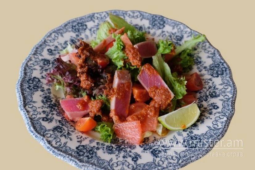 Соковитий обсмажений тунець у поєднанні зі свіжим міксом салатів, солодкими чері та освіжаючим грейпфрутом. Завершує композицію пікантний соус із в`ялених томатів.