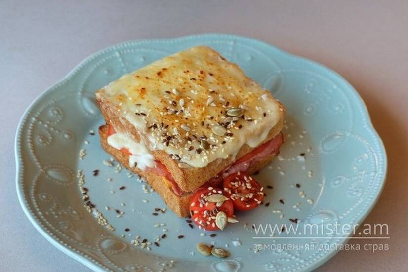 Заквасний тостовий хліб, чеддер шинка, сирний бешамель і пекоріно.