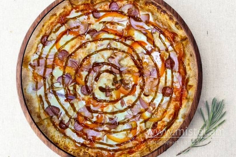 Соус пелаті, сир моцарела, мисливські ковбаски, бекон, перець болгарський, цибуля, соус барбекю.