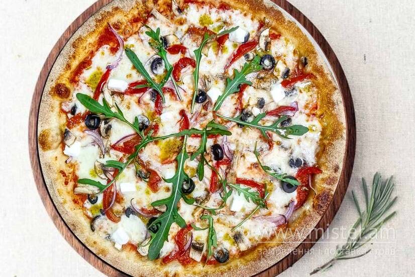 Соус пелаті, сир моцарела, перець болгарський, цибуля, гриби, рукола, маслини, сир фета, соус песто.