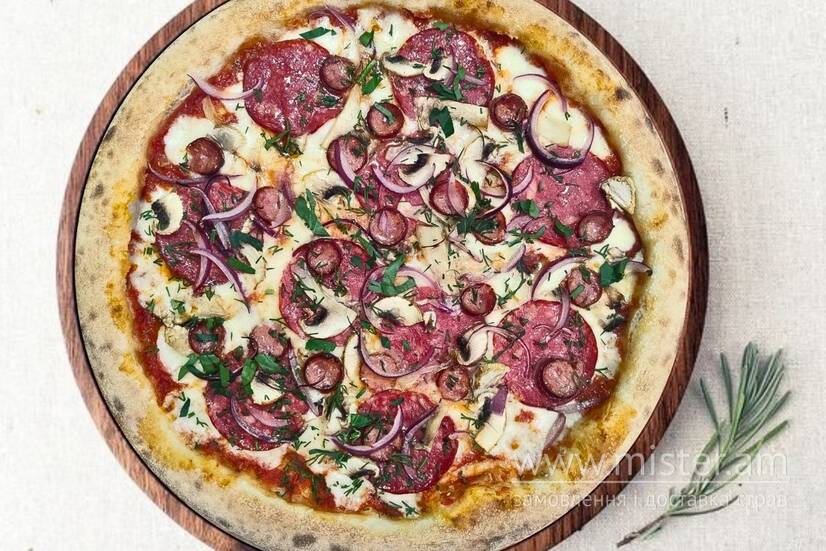 Соус пелаті, сир моцарела, мисливські ковбаски, гриби, салямі, червона цибуля.