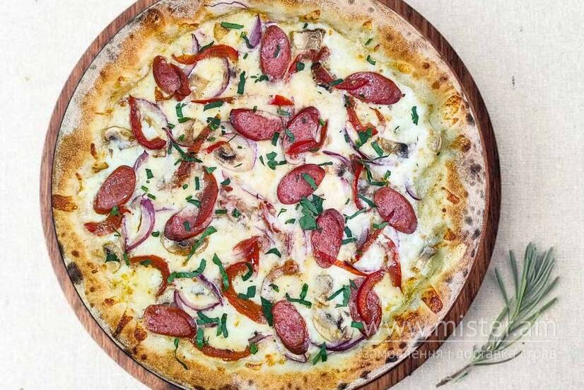 Білий соус з гірчицею, сир моцарела, мюнхенські ковбаски, гриби, перець болгарський, червона цибуля, свіжа зелень.
