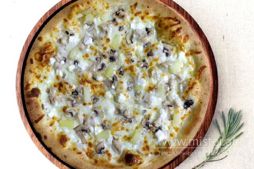 Білий соус, сир моцарела, куряче філе, гриби, ананас, сир фета.