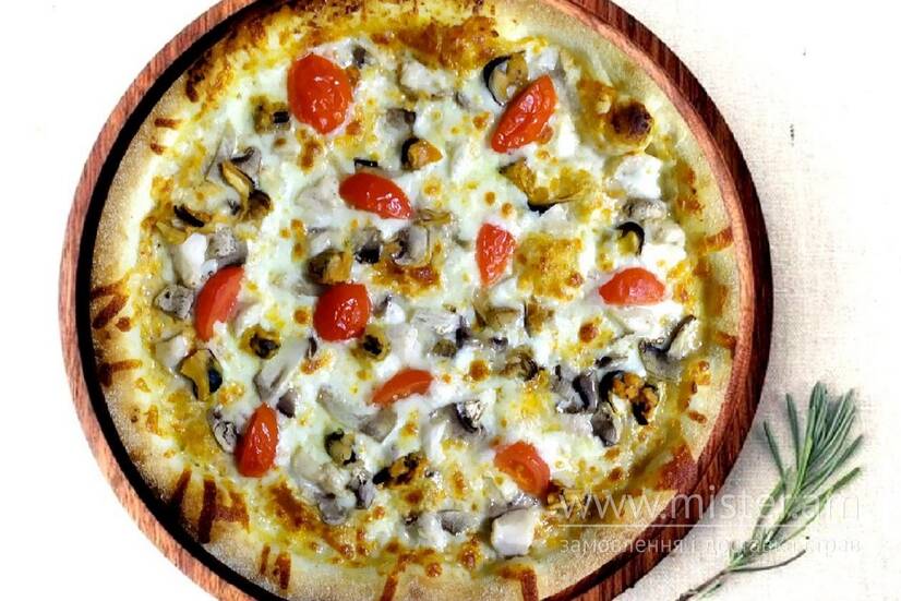 Соус том ям, сир моцарела, куряче філе, мідії, печериці, томати чері.