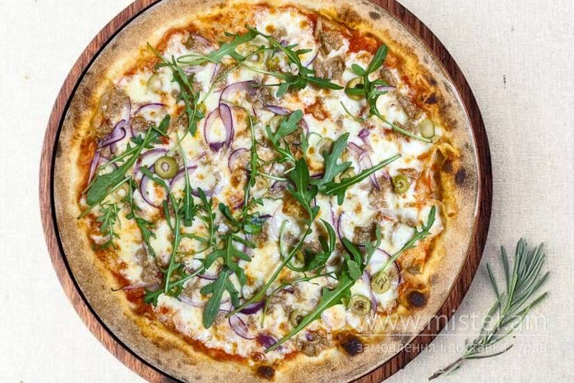 Соус пелаті, сир моцарела, тунець консервований, червона цибуля, оливки, рукола.