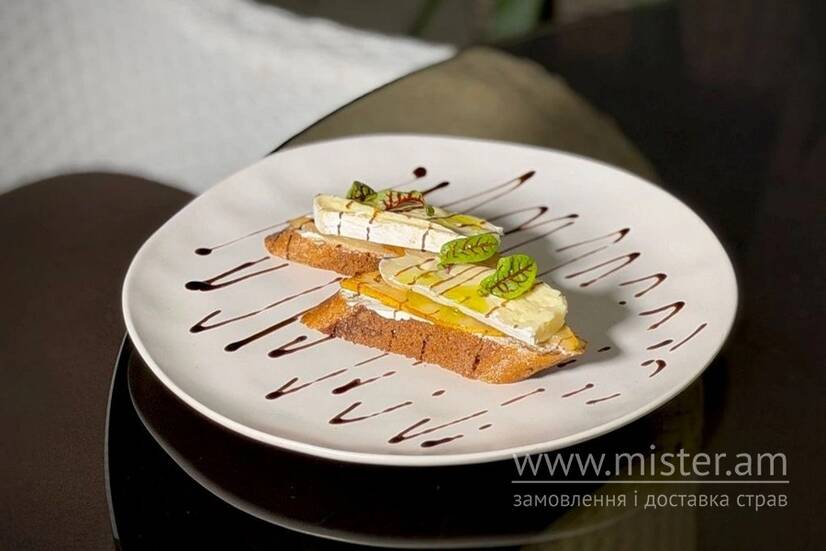 Багет, крем-сир, карамелізована груша, сир брі, рукола, крем бальзамічний.