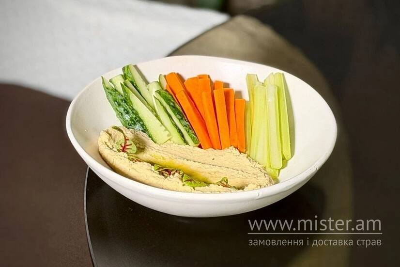 Хумус з пастою тахіні. Подається з селерою, огірком та морквою.
