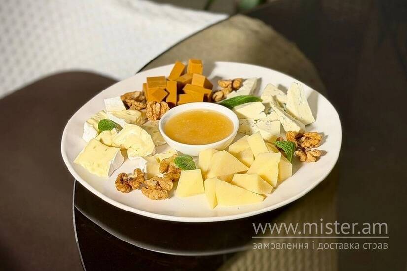 Сир Пармезан, сир брі, блакитний сир дор блю, сир гудбрандсдален, мед, волоські горіхи.