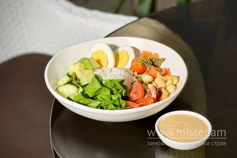Рис, форель, авокадо, горіх кеш`ю, чері, огірок, яйце, соус кунжутно-горіховий, ромен.