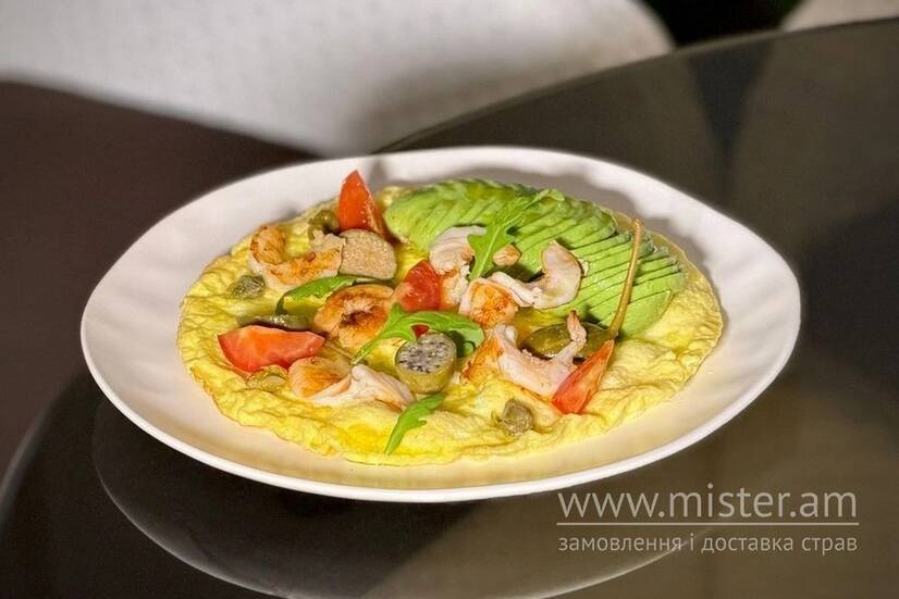Вершковий омлет з креветками, авокадо, каперсами та томатами.