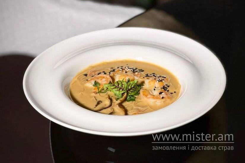Том Ям на основі рибного бульйону, пасти Том Ям, кокосових вершків з грибами Шиїтаке, креветкою, чері та кінзою.