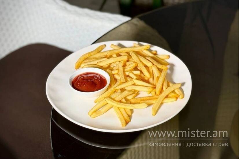 Картопля фрі приготована у фритюрі, подається з томатним соусом.
