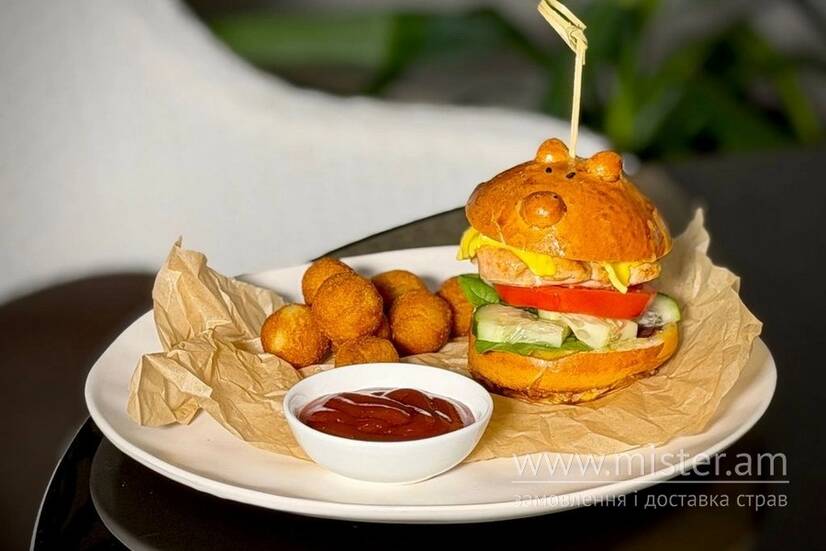Бургер з соковитою курячою котлетою, роменом, огірком та томатом. Подається з картопляними крокетами та томатним соусом.