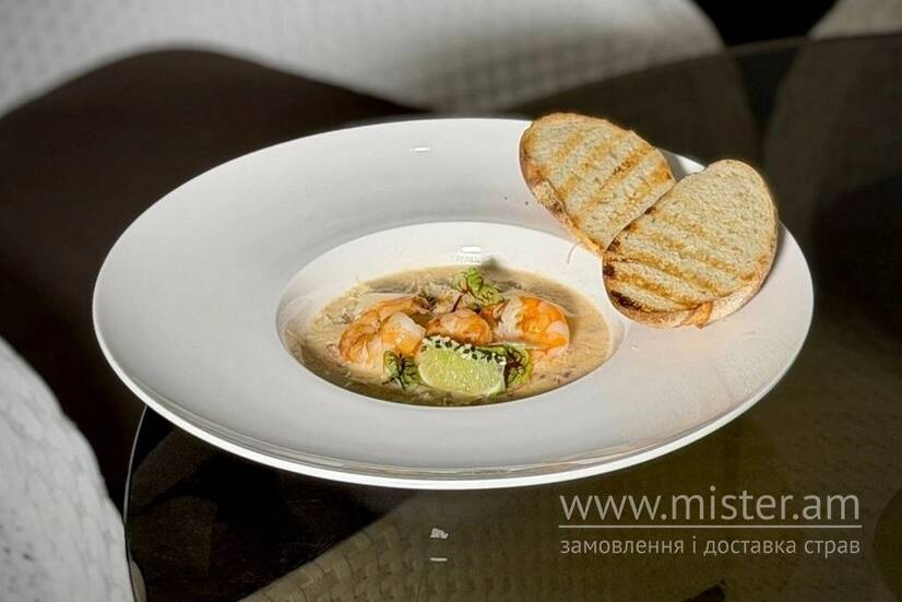 Гребінці, креветка, мідії, цибуля, часник, сир Пармезан, оливкова олія, соус устричний, лайм. Подається з грильованим багетом.