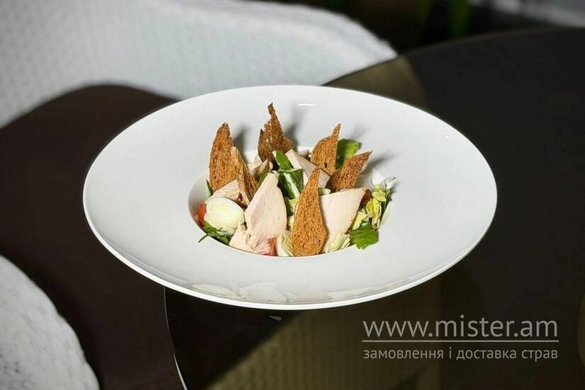 Курча су від, салат айсберг, ромен, перепелине яйце, сир Пармезан, мікро зелень, томати чері, соус Цезар.