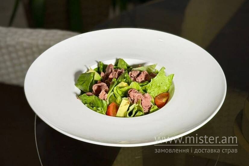 Ростбіф, ромен, авокадо, томати чері, соус чімічурі, медово-гірчична заправка.