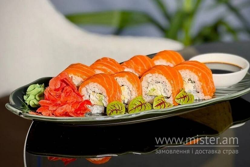 Рис, крем-сир, форель, авокадо, норі, імбир, васабі.