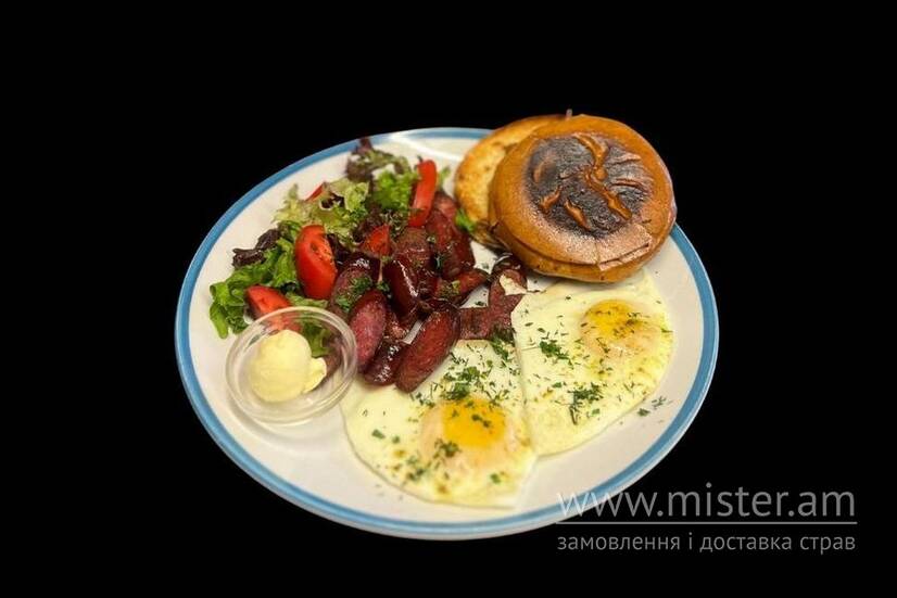 Яєчня, мисливські ковбаски, помідор, лист салату, булочка, масло.