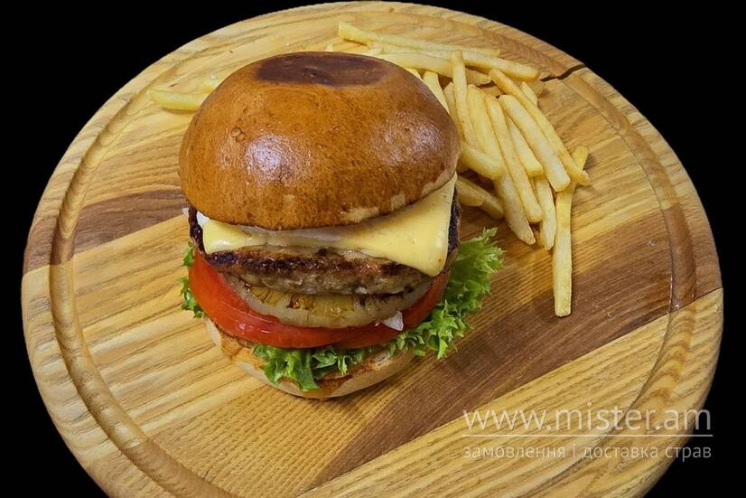 Куряча котлета, ананас, помідор, сир, лист салату, цибуля маринована, соус цезар.