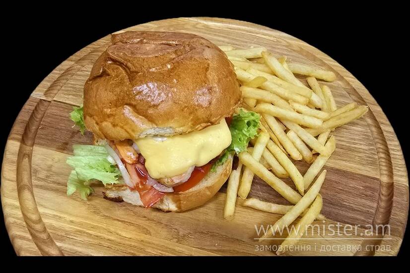 Креветка, помідор, маринована цибуля, сир, лист салату, соус цезар.