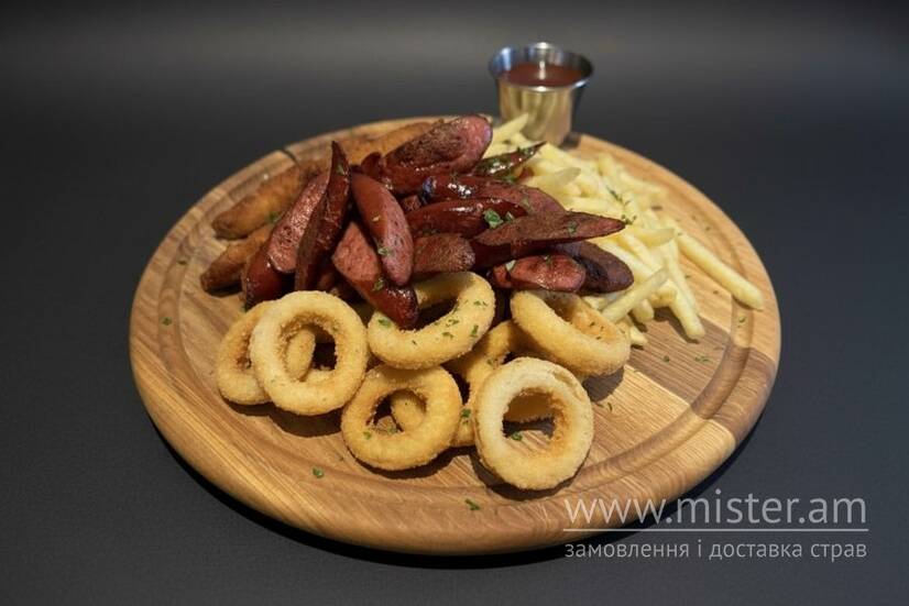 Ковбаски зі свинини, цибулеві кільця, курячі стріпси, картопля фрі.