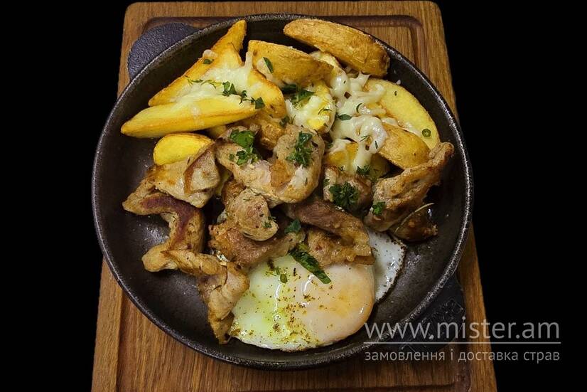 Сковорідка зі свининою, яйцем та картоплею під сиром
