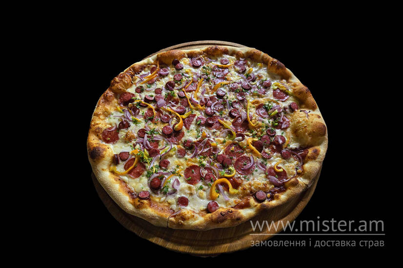 Соус BBQ, моцарела, мисливські ковбаски, папероні, перець солодкий, цибуля червона.