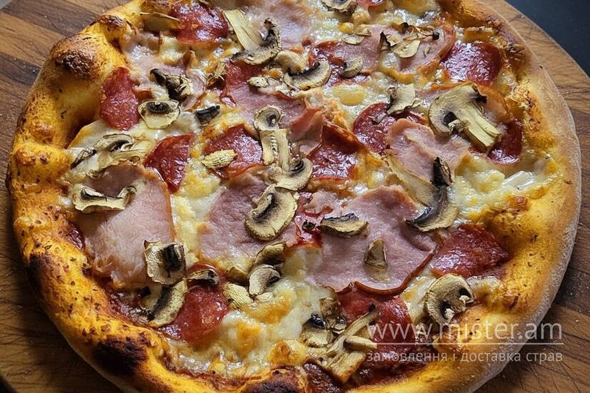 Пілаті, моцарела, шинка, куряче філе, печериці, пепероні.