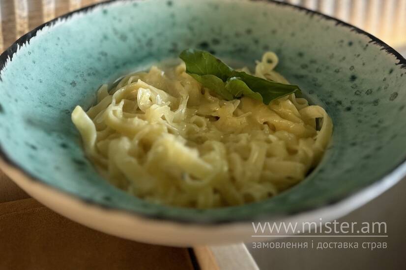 Паста Феттучіні, вершки, моцарела, дор блю, чеддер, пармезан, базилік.