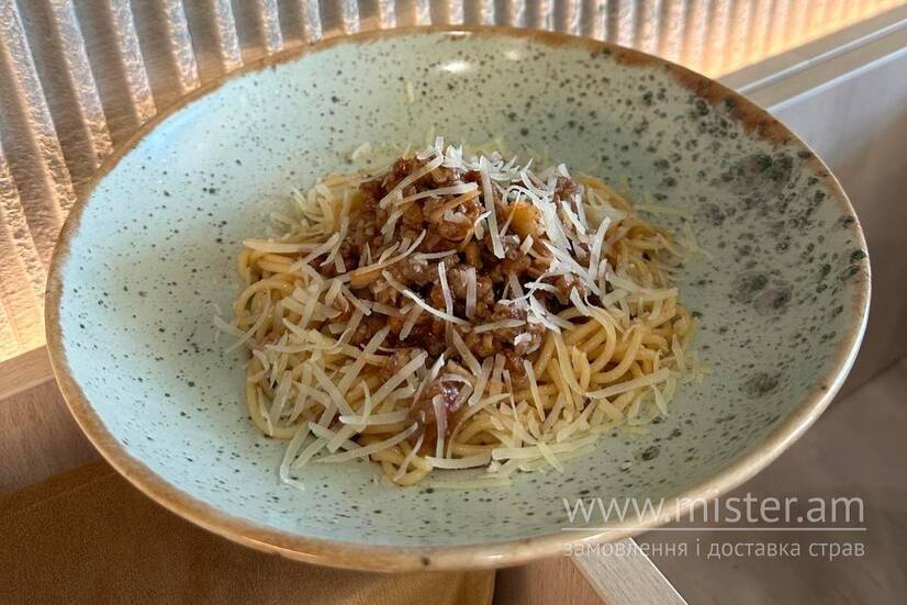 Спагетті, томатна паста, фарш з телятини, пармезан, цибуля.