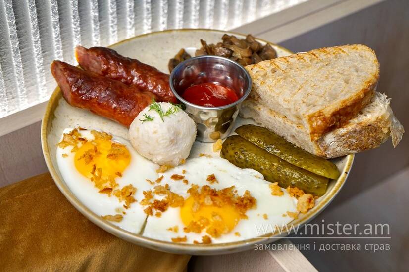 Яйця, ковбаски домашні, шампіньйони з цибулею, хліб, намазка з кропом і часником, солоні огірочки, кетчуп.