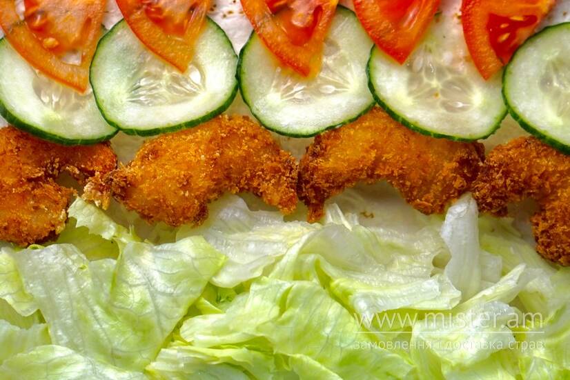 Лаваш, соус часниковий, салат Айсберг, помідор, огірок свіжий, креветки панко у фритюрі.