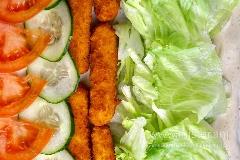 Лаваш, соус часниковий, салат Айсберг, помідор, огірок свіжий, стріпси курячі у фритюрі.