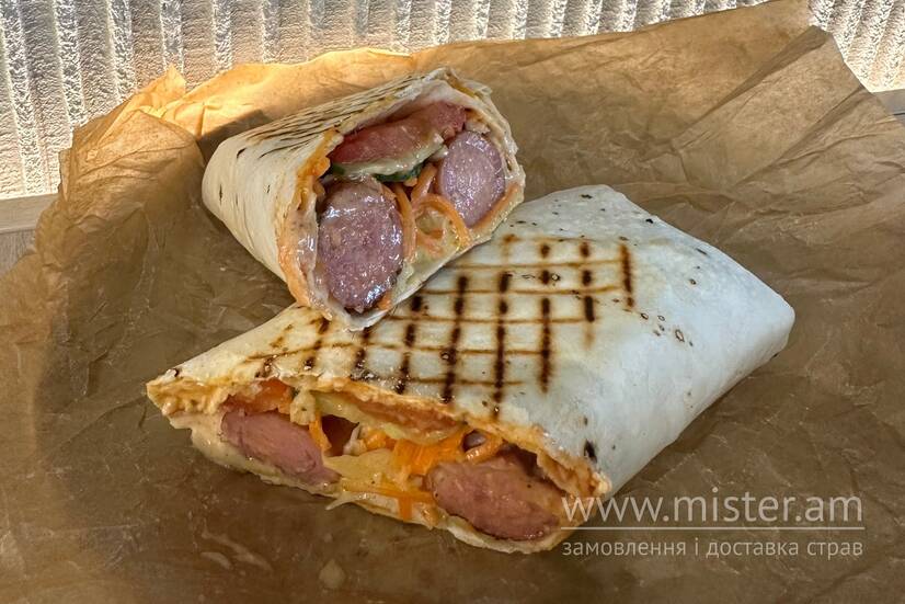 Лаваш, 2 сосиски на вибір, соус часниковий, кетчуп, свіжа капуста, свіжий огірок, помідор.