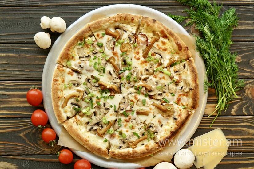 Фірмовий грибний соус, сир моцарелла, консервовані опеньки, свіжі шампіньйони, шинка, цибуля зелена.