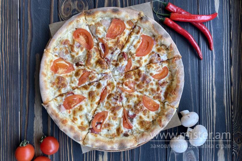 Фірмовий білий соус, свинина, філе куряче, мисливські ковбаски, салямі, шинка, бекон, томати, сир Моцарелла.