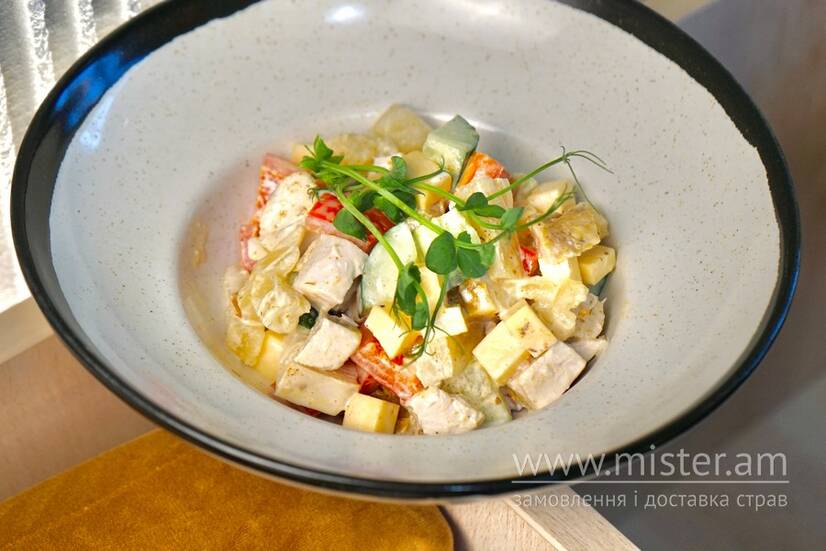 Філе куряче, ананас, огірок, перець болгарський, сир, майонез.
