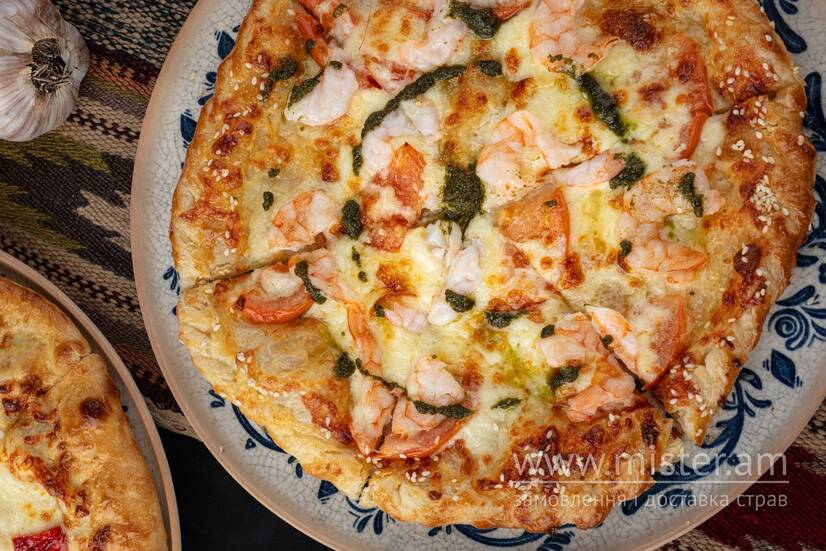 Фірмовий хачапурі з хрусткого листкового тіста, соковитою креветкою та грузинським песто.