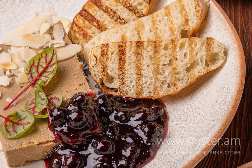 Ніжний паштет з курячої печінки, мигдальні пластівці, соус з чорної смородини.