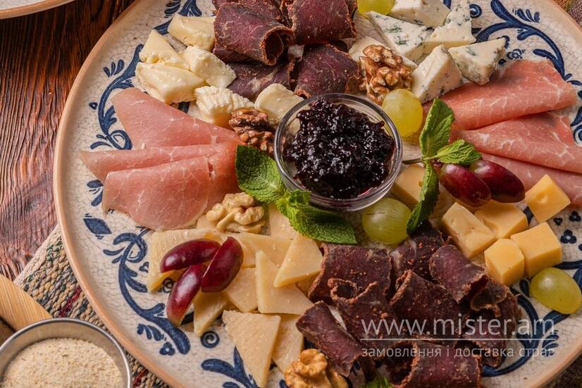 Сир Радомер, Дорблю, Пармезан, Брі, прошуто, бастурма, прикраса: горіхи та виноград.