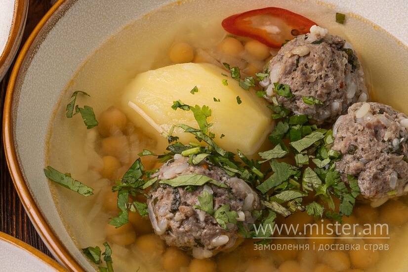Легкий суп з баранячими кюфтами, картоплею та нутом.