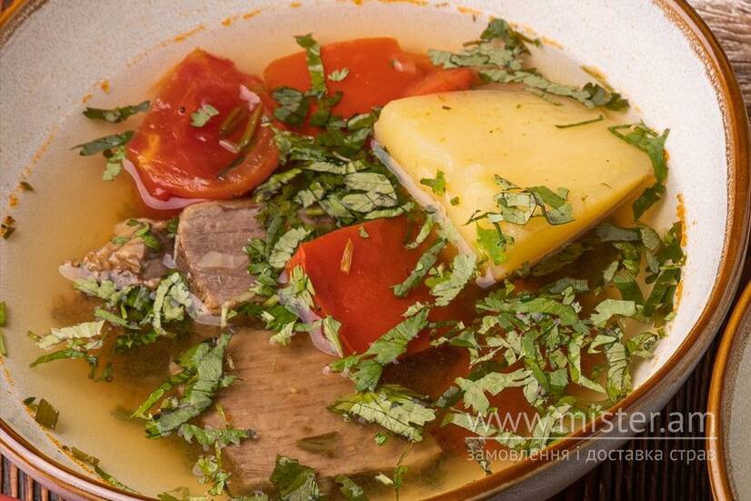 Бульйон з яловичиною, паприкою томатами та картоплею.