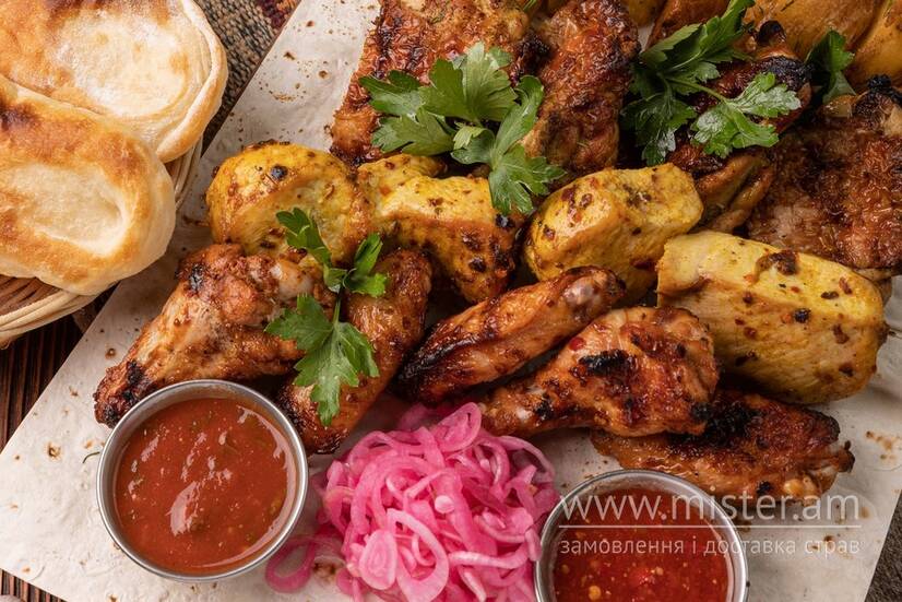 Шашлик курячий, курячі крильця в аджиці, курячі стегенця в апельсиновому соусі та соуси Аджика, Сацебелі.