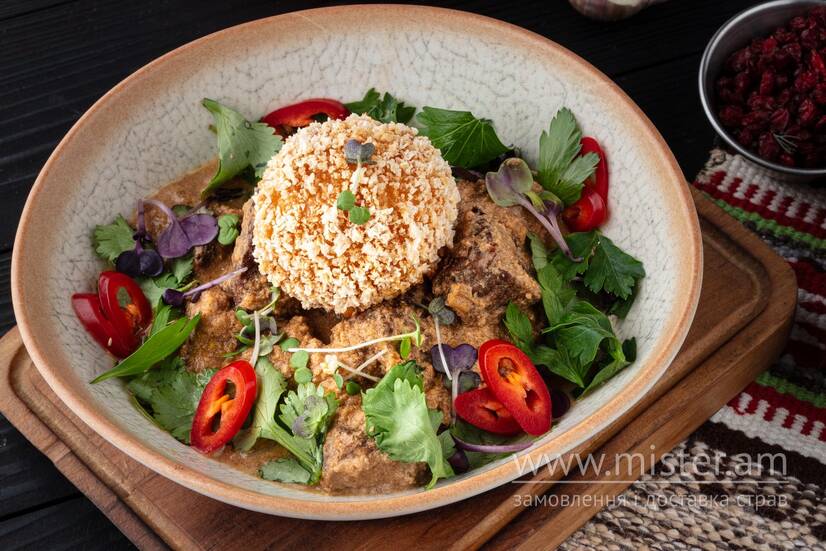 Традиційна картвельська страва — легенда західної Сакартвело: молоденька телятина, тушкована в горіховому соусі, з сирним еларджі болом.