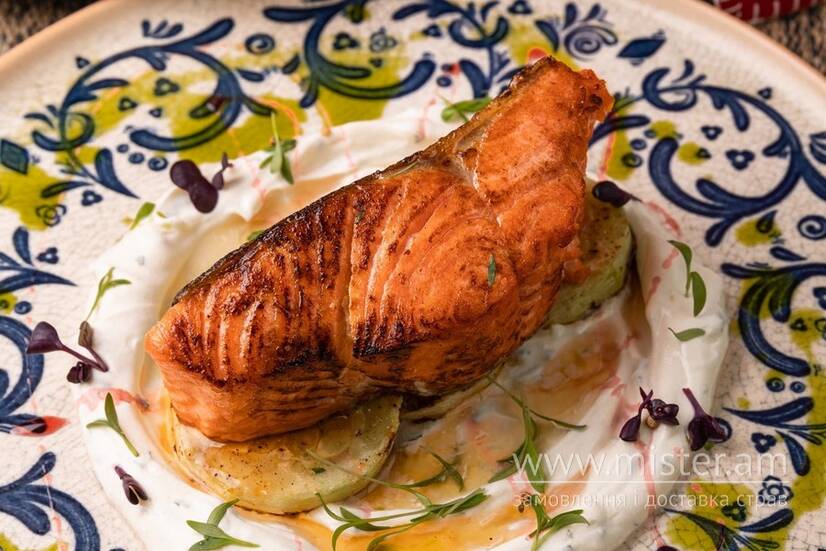 Ароматний стейк з соковитого філе лосося, цукіні та вершково-м'ятний соус.