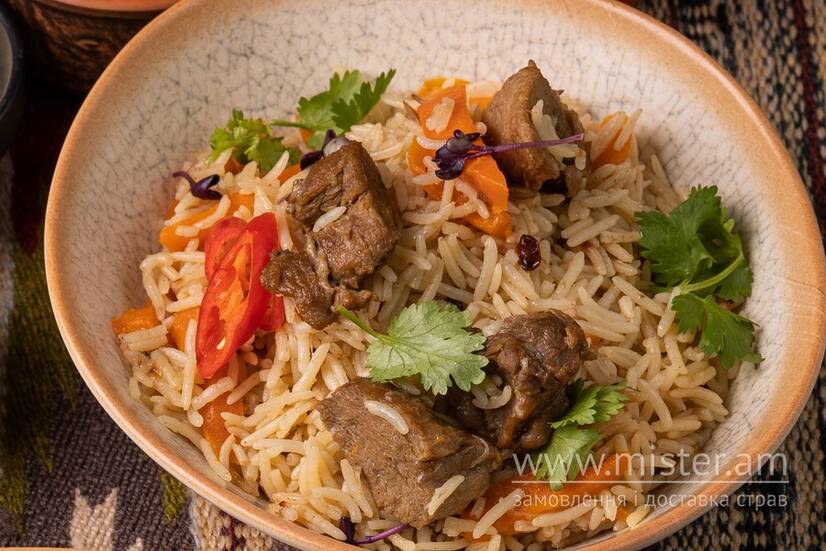 Страва з пристрасним характером: пристойна порція плову з яловичиною, приготована зі смачними спеціями, щоб залишити слід у вашому серці.